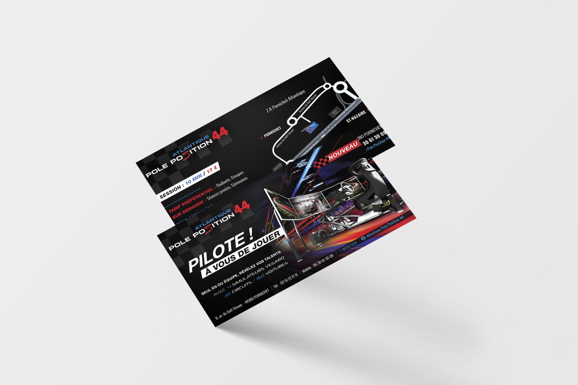 Conception et mise en page d'un flyer pour Atlantique Pole Position 44, concept de simulateurs automobiles à Pornichet.